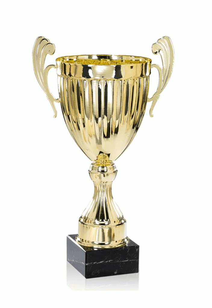 Zlatý pohár na podstavci, na ktorom je priestor pre štítok s vygravírovaným textom.