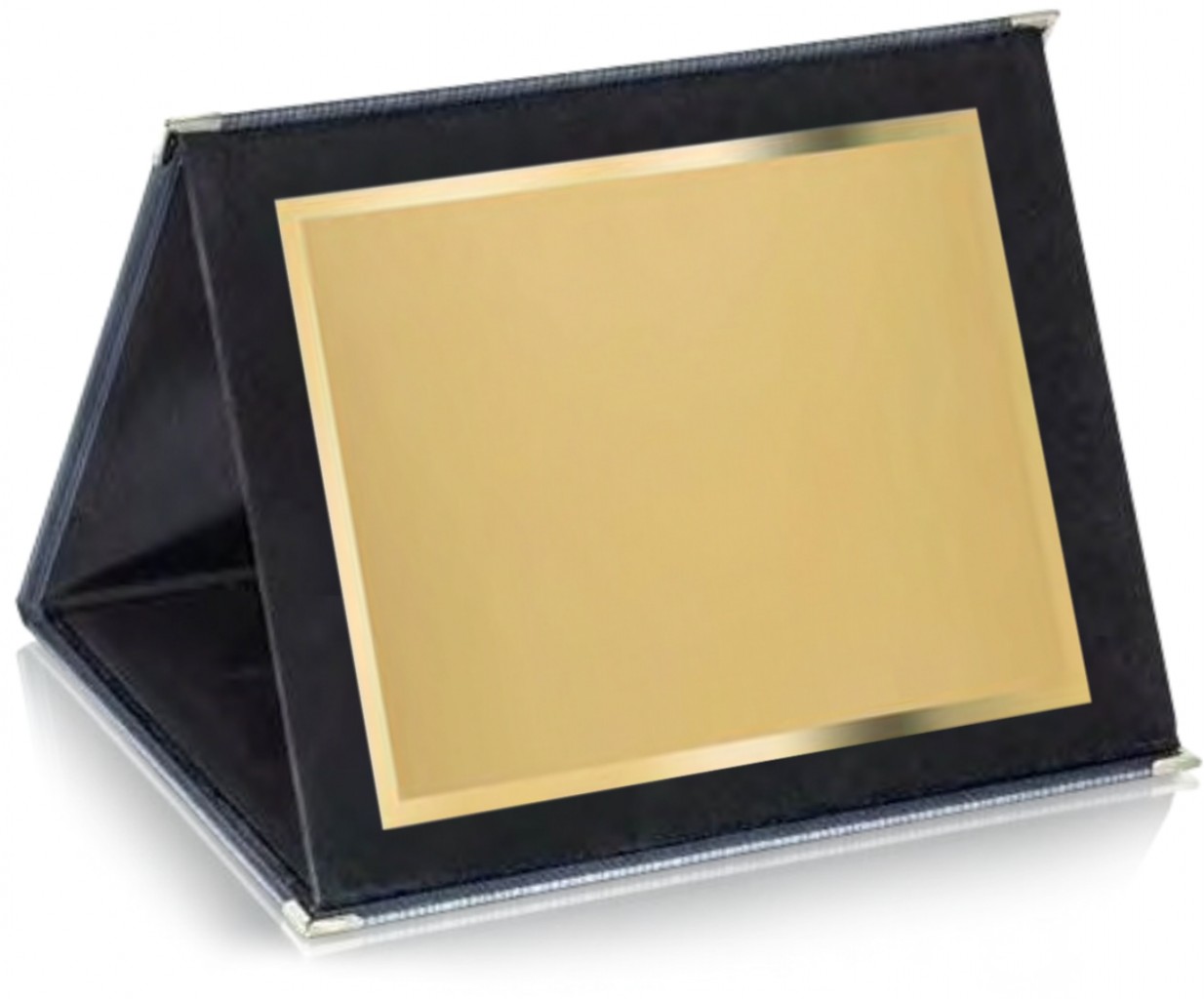 Stojata kazeta potiahnutá čiernym sametom so zlatou kovovou plaketou, vhodnou pre farebnú potlač.