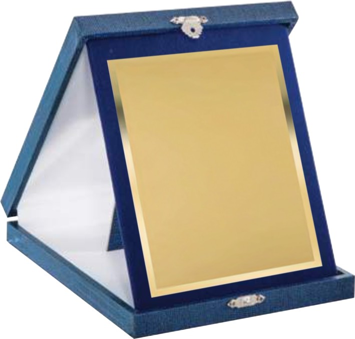 Stojatá kazeta modrej farby so zlatým kovovým diplomom, vhodným pre potlač.
