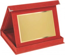 Kazeta červenej farby so zlatým kovovým diplomom, vhodným pre potlač.