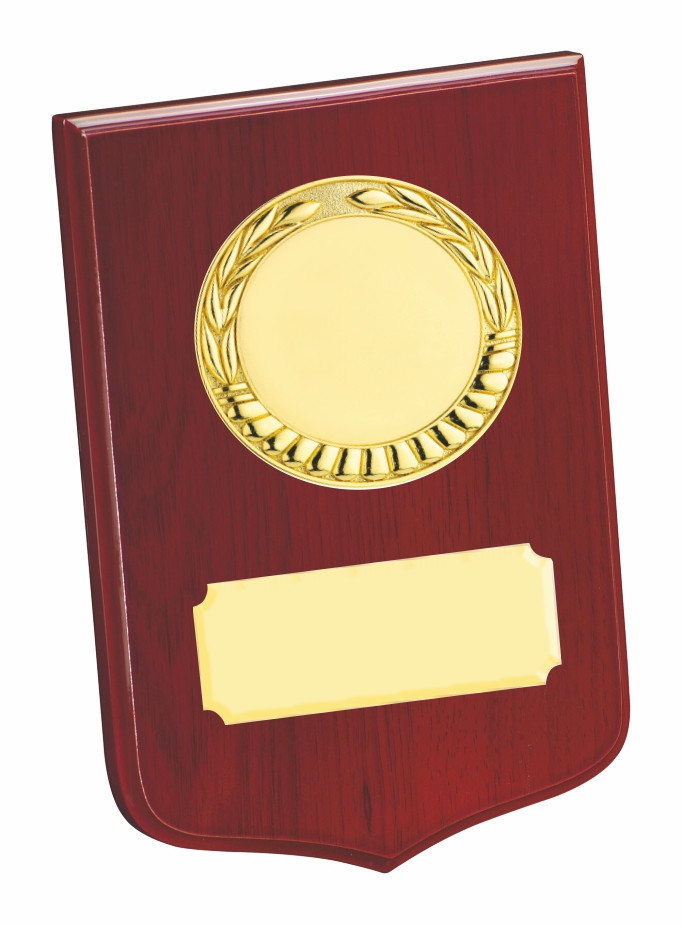 Drevený štít so zlatou kovovou plaketou vhodnou pre farebnú potlač a štítkom vhodným pre gravírovanie.