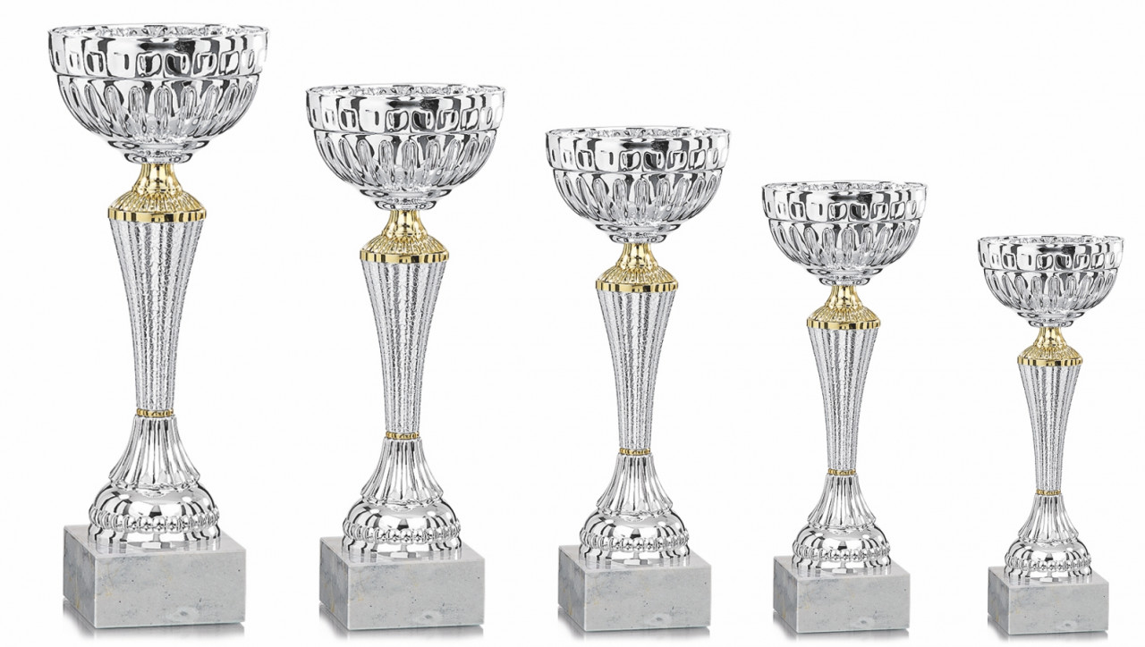 Strieborný pohár na podstavci, na ktorom je priestor pre štítok s vygravírovaným textom.