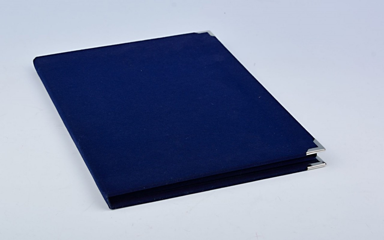 Stojata kazeta potiahnutá modrým sametom so strieborným kovovým tanierom, vhodným pre gravírovanie.