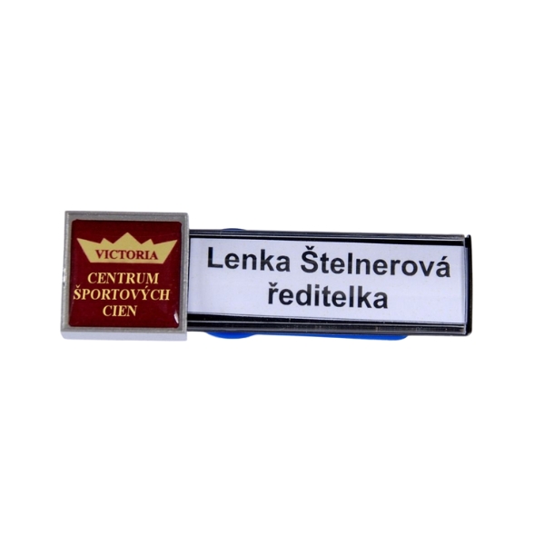 Plastová menovka so zasúvacím profilom na meno, logotyp ( čírá alebo farebná samolepka potiahnutá živicou ) veľkosť: priestor pre logotyp 20 x 20 mm + 50 x 17 mm, upevnenie magnet, farba strieborná