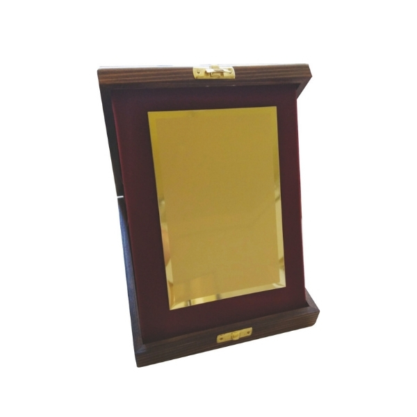 Drevená kazeta so sametovým vnútrom, v ktorom je vložena kovová plaketa vhodná pre farebnú potlač. Rozmer kazety : 15,5 x 21 x 3,5 cm.