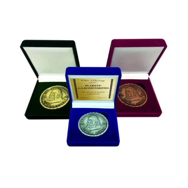 Sametová krabička v troch farebných prevedeniach s rozmerom 8 x 8 x 3 cm.V krabičke je vložená razená kovová medaila s diamantovým okrajom s priemerom 5 cm s možnosťou výberu zo štyroch povrchových úprav.