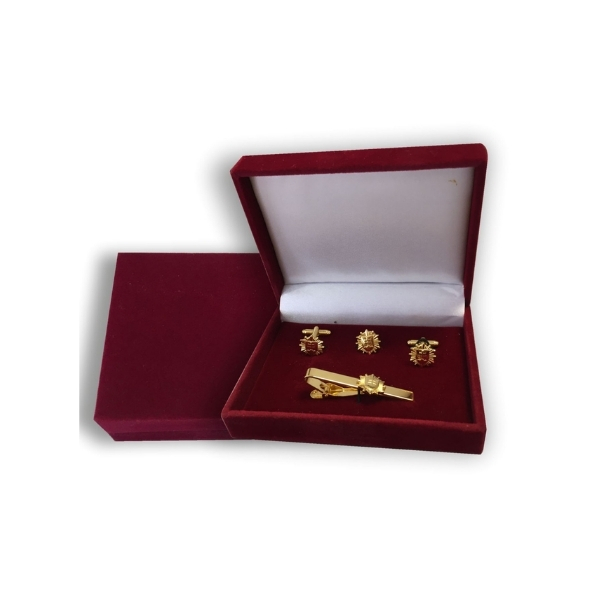 Exkluzívny set dvoch manžetových gombíkov a jedného odznaku so sponou na kravatu so znakom PZ v sametovej krabičke.