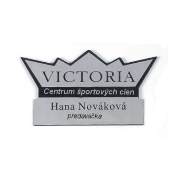 Plastový štítok podľa špecifikácie a tvaru loga zákazníka, farba zlatá alebo strieborná, veľkosť cca 6×4 cm, upevnenie magnet