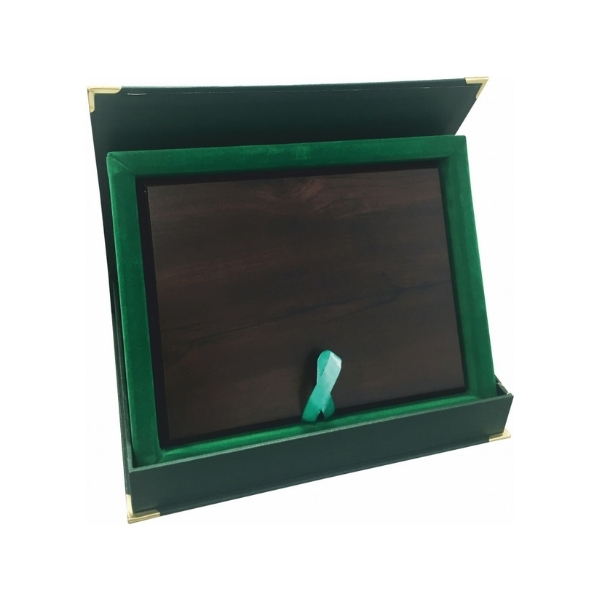 Drevená plaketa umiestnená v zelenej kazete so sametovým vnútrom s kovovým diplomom s možnosťou plnofarebnej potlače. Rozmer kazety: 27,5 x 22,5 cm. Rozmet drevenej plakety : 23 x 17,5 cm. Rozmer diplomu : 16 x 12 cm