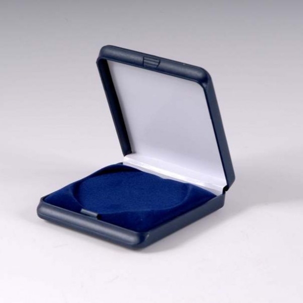 Plastová krabička- modrá, lôžko pre medaile 70 mm. Celková veľkosť krabičky je 85 x 85 mm.