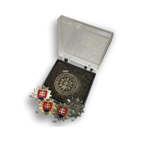 Kovový odznak o priemere 1,7 cm, razený v 3D prevedení. Odznak je umiestnený v plastovej krabičke. Farebné prevedenie v zlatej, striebornej alebo bronzovej patine.