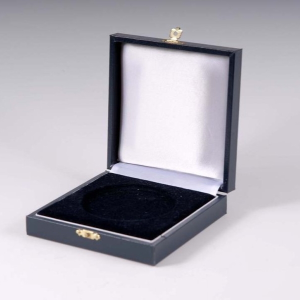 Ručne robená drevená kazeta potiahnutá kožou. Lôžko pre medaile v sametu do priemeru 80 mm. Celková veľkosť kazety je 100x100x30 mm.