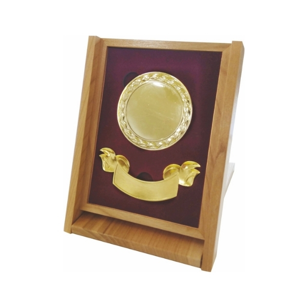 Drevená kazeta so sametovým bordovým lôžkom, v ktorom je umiestená zlatá medaila vhodná pre potlač a ozdobná kovová stuha, vhodná pre gravírovanie. Rozmery kazety : 18 x 13,5 x 3,5 cm.