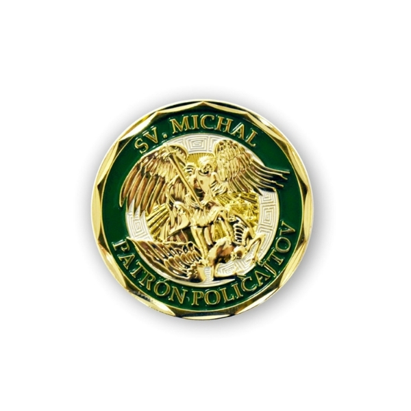 Kovová minca s 3D razbou s priemerom 4 cm. Je v zlatom prevedenı ́so zeleným okrajom po obvode mince, v ktorom je v hornom polkruhu vložený nápis „Svätý Michal“ a v dolnom polkruhu vložený nápis „Patrón policajtov“