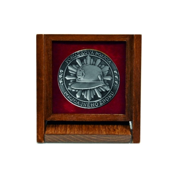 Strieborná kovová minca s 3D razbou so znakom služby poriadkovej polıćie s priemerom 6 cm.