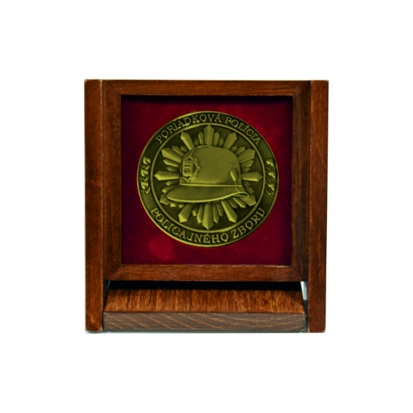 Zlatá kovová minca s 3D razbou so znakom služby poriadkovej polıćie s priemerom 6 cm.