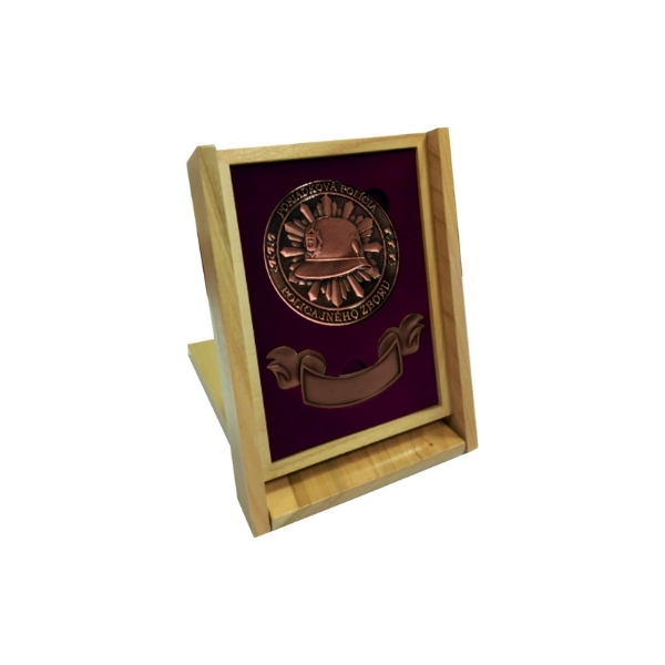 Bronzová kovová minca s 3D razbou so znakom služby poriadkovej polıćie s priemerom 6 cm, pod ktorou je umiestnená kovová stuha, do ktorej je možné vložiť štítok s vygravírovaným textom.
