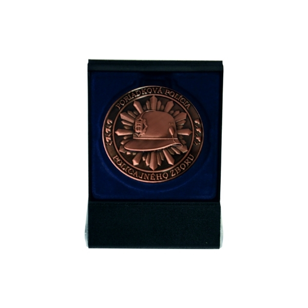Bronzová kovová minca s 3D razbou so znakom služby poriadkovej polıćie s priemerom 6 cm.