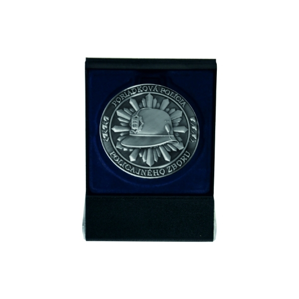 Strieborná kovová minca s 3D razbou so znakom služby poriadkovej polıćie s priemerom 6 cm.