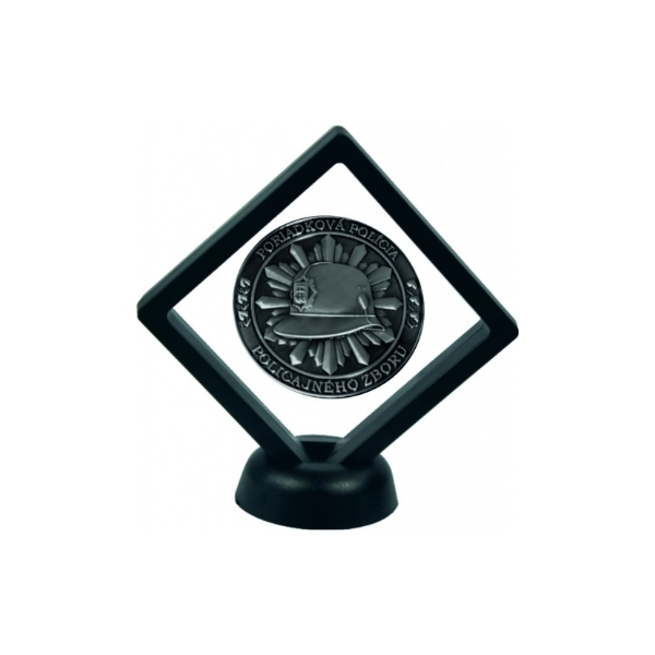 Minca je vložená v kosoštvorcovom plastovom rámiku na podstavci