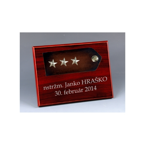 Drevená plaketa s kovovu výložkou a hodnosťou na zavesenie alebo na postavenie do vitríny,