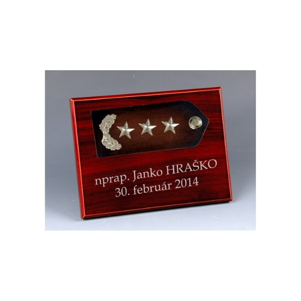 Drevená plaketa s kovovu výložkou a hodnosťou na zavesenie alebo na postavenie do vitríny,
