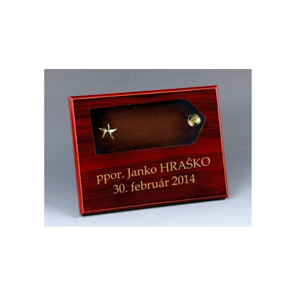 Drevená plaketa s kovovu výložkou a hodnosťou na zavesenie alebo na postavenie do vitríny,