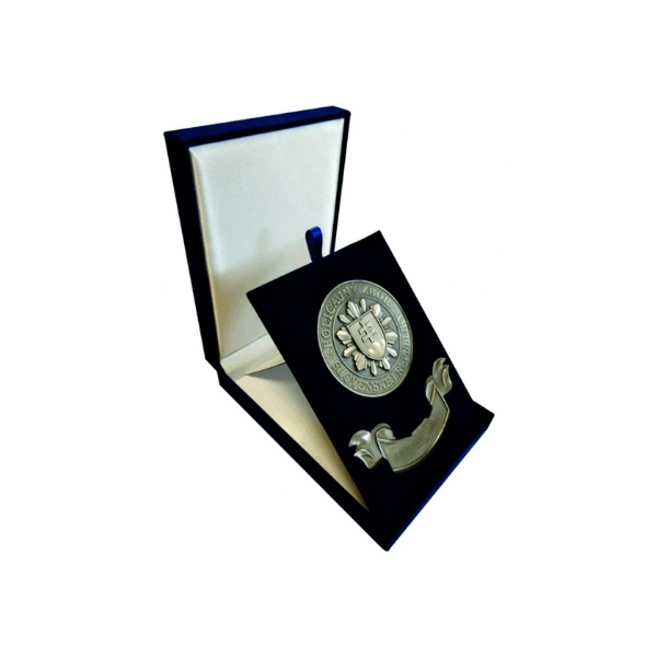 Modrá sametová krabička s medailou Policajného zboru a kovovou stuhou, do ktorej je možné umiestniť gravírovaný štítok.