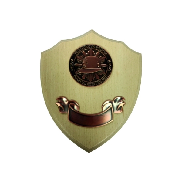 Bronzová kovová minca s 3D razbou so znakom služby poriadkovej polıćie s priemerom 6 cm na drevenom štıt́e s kovovou stuhou, na ktorý je možné vložiť vygravıŕovaný štıt́ok