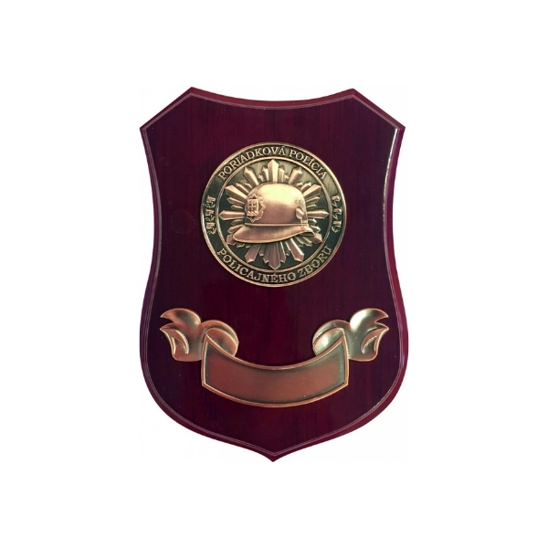 Bronzová kovová minca s 3D razbou so znakom služby poriadkovej polıćie s priemerom 6 cm na drevenom štıt́e s kovovou stuhou, na ktorý je možné vložiť vygravıŕovaný štıt́ok