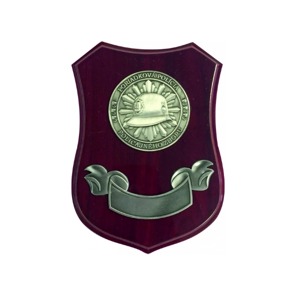 Strieborná kovová minca s 3D razbou so znakom služby poriadkovej polıćie s priemerom 6 cm na drevenom štıt́e s kovovou stuhou, na ktorý je možné vložiť vygravıŕovaný štıt́ok