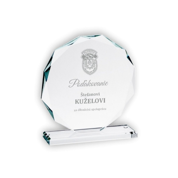 Sklenená plaketa hrubá 1,2 cm s priemerom 17 cm.