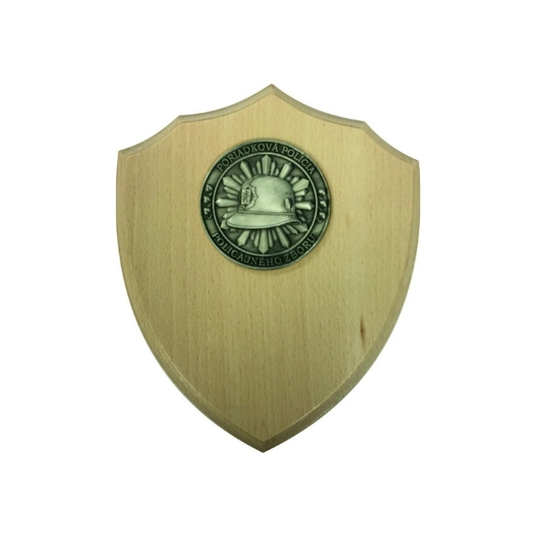 Strieborná kovová minca s 3D razbou so znakom služby poriadkovej polıćie s priemerom 6 cm na drevenom štıt́e do ktorého je možné gravírovať text