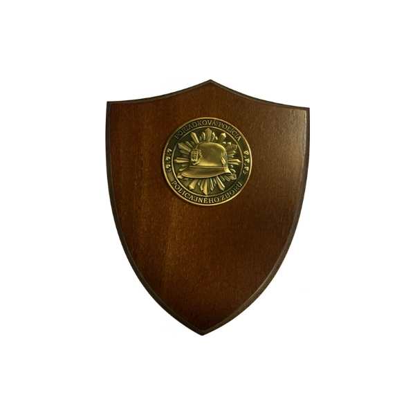 Zlatá kovová minca s 3D razbou so znakom služby poriadkovej polıćie s priemerom 6 cm na drevenom štıt́e do ktorého je možné gravírovať text