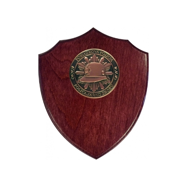 Bronzová kovová minca s 3D razbou so znakom služby poriadkovej polıćie s priemerom 6 cm na drevenom štıt́e do ktorého je možné gravírovať text