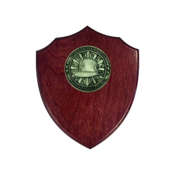 Strieborná kovová minca s 3D razbou so znakom služby poriadkovej polıćie s priemerom 6 cm na drevenom štıt́e do ktorého je možné gravírovať text