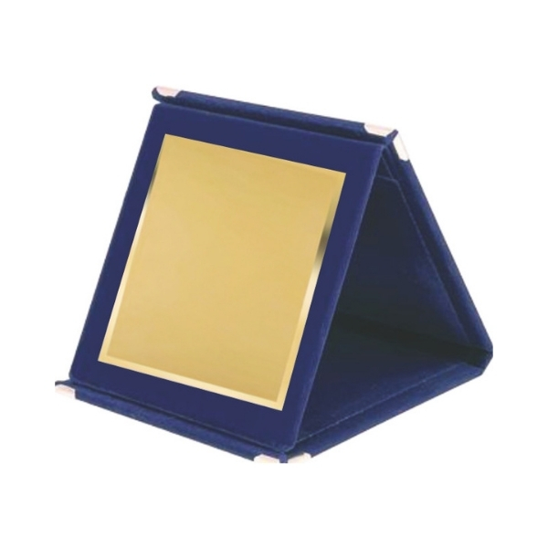 Stojata kazeta potiahnutá modrým sametom so zlatou kovovou plaketou, vhodnou pre farebnú potlač. Kazeta má v zatvorenom stave rozmery 14 x 14 x 1,5 cm a kovová plaketa 12 x 9 cm.