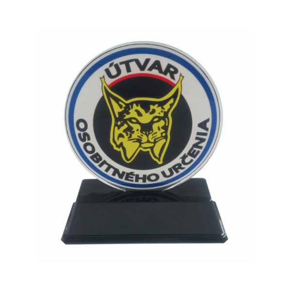 Akrylová plaketa na čiernom plastovom podstavci, na ktorý je moźné umiestniť štítok s vygravírovaným textom.